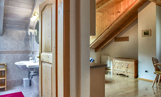 Die kleine Dachgeschosswohnung ist ideal für Paare. Sie wirkt sehr gemütlich und romantisch. Die Einrichtung besteht fast ausschließlich aus Tannenholz.